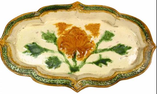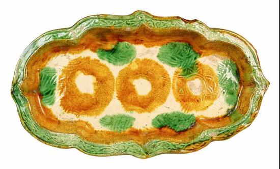 契丹民族文化因素。契丹民族作为游牧民族,逐水草而居,对其所生活的环境有着独特的眷恋情结,钟情于蓝天、白云、绿草、清水,集中表现在三彩器物上,就是黄、绿、白三色为主流,充分体现了契丹民族自由、奔放的民族性格。对大自然的热爱进而上升到对于大自然恩赐事物的崇拜,菊花、葵花、牡丹、蝴蝶、水波等常见的大自然纹饰都被广泛应用于辽三彩,海棠盘就是一个典型例证。