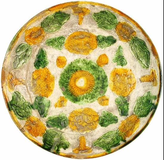 辽三彩器型主要有各式盘、碗和镶接器,以盘、碗为大宗。施彩方式有两种,一是色地点彩,一是压印(印模)填涂彩。均施一层白色化妆土。彩主要是黄、绿、白三种色调。三种色彩的搭配看似毫无章法,但有着缜密的设计理念,作为边饰的白色以及黄、绿色讲究自然过渡,互不侵扰,三种色彩有严格的主次之分。