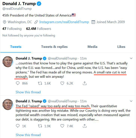 而在“靴子”还没落地前,特朗普似乎就对美联储释放的降息信号并不满意。7月29日晚,他在个人官方推特上发文称,美联储的利率“加得”太早、太多了,小幅降息是不够的。