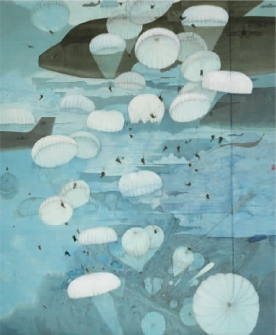 张蕊说,这幅作品的灵感来源于一幅空降兵的照片,照片里仅有的一位空降兵让她浮想联翩,“那朵降落伞好美好美” 。而后,她又被动画电影《大鱼海棠》中“鲲”的出场所吸引,于是她的脑海中浮现出一架架有如深海里穿梭大鱼一样的飞机。她尽情发挥着自己的想象,在画面的上、中、下三个部分用平视、仰视、俯视三个视角去安排画面。大地鸟瞰、透视感十足的朵朵降落伞和深色的飞机背景融合在同一画面中。正如美术评论家刘曦林所说,军旅美术创作“想象力比知识更重要” 。