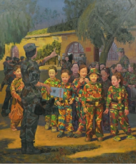 曹加新、李艺凝创作的《枣园晨曦》是展览中少见的儿童题材作品。成为父亲后,曹加新开始对儿童题材变得敏感。他思索:如果把毛主席的延安旧居和穿着迷彩服的少年儿童组合在一个画面里会有怎样的效果呢?毛主席的延安旧居是真实可感的,那群天真烂漫的穿着迷彩服的一年级小学生也是他记忆里留存的。“现在有很多面向学生的社会大课堂,往往都是带孩子们去旅游景点。如果孩子们到延安毛主席旧居参观,会有怎样的体验呢? ”曹加新说。记者注意到,画面上的小孩没有都望向前景中的讲解员,而是各有专注?!耙荒昙逗⒆拥淖ㄗ⒘Σ豢赡芴乇鹎?,如果都看着讲解员,反而不真实了。 ”曹加新说,希望能够通过这幅画作唤起年轻父母对红色教育的重视。