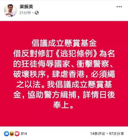 针对此事,全国政协副主席、香港特区前特首梁振英在其个人脸书发帖表示强烈谴责并发出了“悬赏令”。