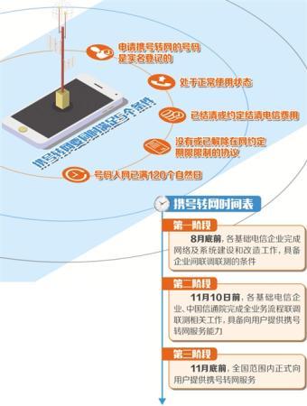 按照今年3月份工信部给出的时间表,第一阶段是8月底前,各基础电信企业完成网络及系统建设和改造工作,具备企业间联调联测的条件。第二阶段是11月10日前,各基础电信企业、中国信通院完成全业务流程联调联测相关工作,具备向用户提供携号转网服务能力。第三阶段是11月底前,全国范围内正式向用户提供携号转网服务。其中,天津、海南、江西、湖北、云南5?。ㄊ校┮?月20日前完成试验,正式向用户提供携号转网服务。