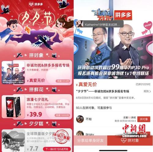 中新网8月6日电 七夕将至,新电商平台拼多多打造超级IP“夕夕节”,并联手非诚勿扰,跨界推出“拼对象”活动,受到了年轻用户热捧。8月3日-7日,在拼多多APP搜索框搜“拼对象”,即可参加活动。
