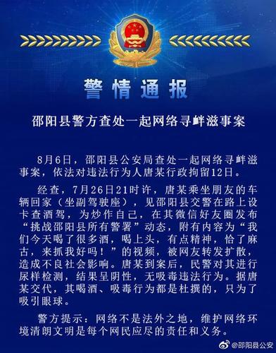 湖南省邵阳市邵阳县公安官方微博8月8日发布警情通报称,8月6日,邵阳县公安局查处一起网络寻衅滋事案,依法对违法行为人唐某行政拘留12日。