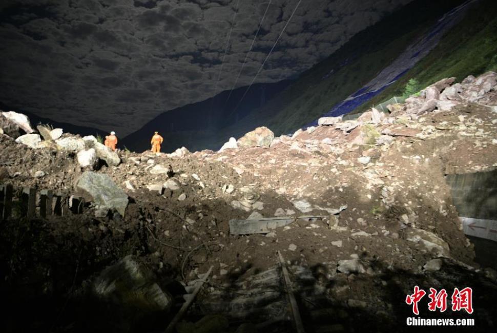 8月15日,四川甘洛,成昆铁路埃岱站区间附近发生的山体垮塌现场,失联人员搜救工作紧张进行。图为垮塌的泥石堆边上,长满植被的山体有一条裂缝。中新社记者 刘忠俊 摄