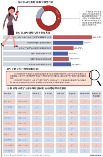 近日,新京报记者联合国家计算机病毒应急处理中心,对109款APP的安装包APK进行了引擎检测,检测结果发现,83.6%的APP安装包中均含有超出其原本业务范围之外的权限代码。109款APP中有超过半数的APP安装包里含有索取用户通讯录的代码。