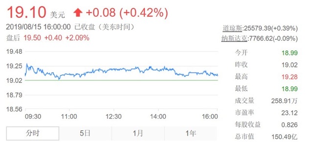 中通快递集团董事长赖梅松总结称:“2019年开始,中通提速发展,制定了高出行业平均业务量增速至少15个百分点的目标。上半年的业绩表现证明了我们战略方向的合理性和策略执行的有效性。”截至美国东部时间8月15日股市收盘,中通快递报19.1美元/股,股价上涨0.42%,市值150亿美元。