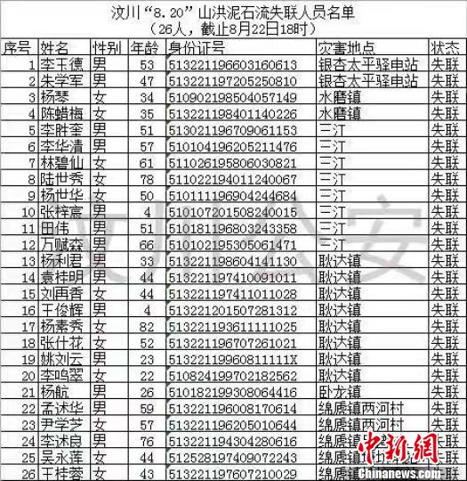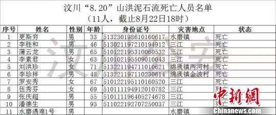 中新网成都8月22日电 (王鹏 安源)记者22日汶川县公安局获悉,截至当日18时,汶川“8.20”强降雨特大山洪泥石流灾害已致11人遇难26人失联。汶川县公安局同时更新了相关人员名单。