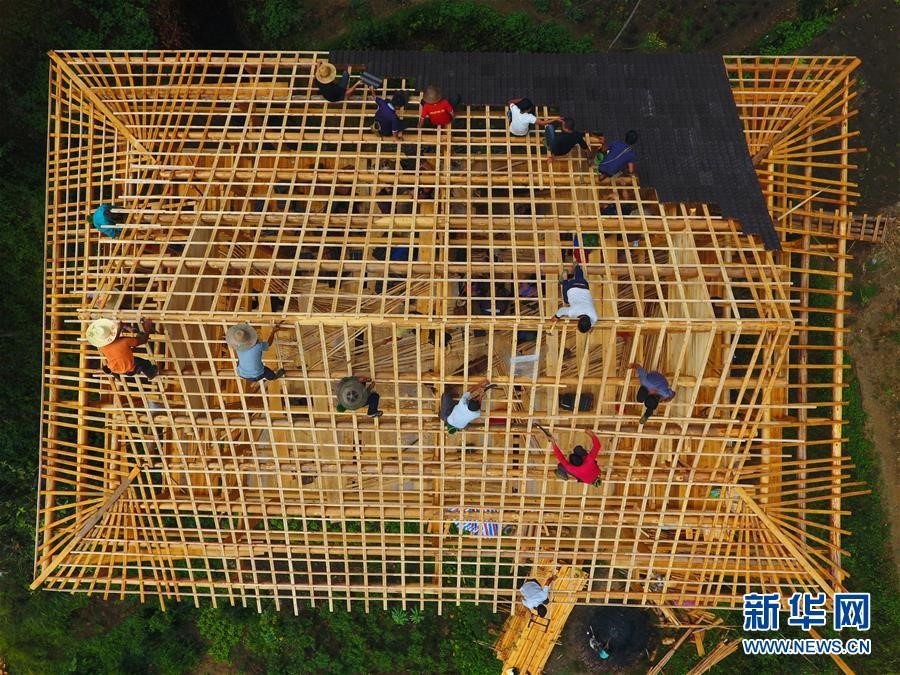 在黔桂乌英苗寨,群众在帮助贫困户吴仕足修建新木楼