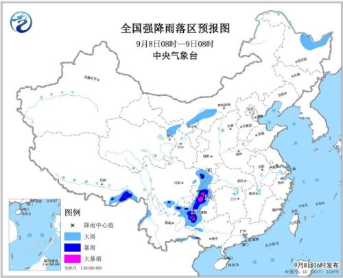 中新网9月8日电 据中央气象台网站消息,中央气象台9月8日06时继续发布暴雨蓝色预警:预计,9月8日08时至9日08时,贵州西部和北部、重庆、四川东部和南部、云南东北部、广西西部等地的部分地区有大雨或暴雨,其中贵州北部和西南部、重庆南部局地大暴雨(100~180毫米)。