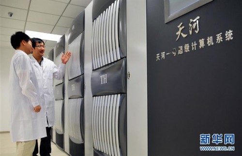 国家超算天津中心应用研发部部长孟祥飞(右一)带同事巡检“天河一号”运行状况(资料照片)。 新华社记者 毛振华 摄