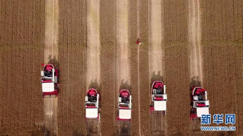 在山东省济宁市嘉祥县仲山镇,工作人员操作收割机收割小麦(5月31日无人机拍摄)。 新华社记者 郭绪雷 摄