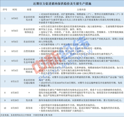 从部委层面来看,8月末至今,农业农村部、发改委、财政部、自然资源部、生态环境部、交通运输部、银保监会等多部门相继10次表态,力促猪肉保供稳价,支持生猪生产发展。