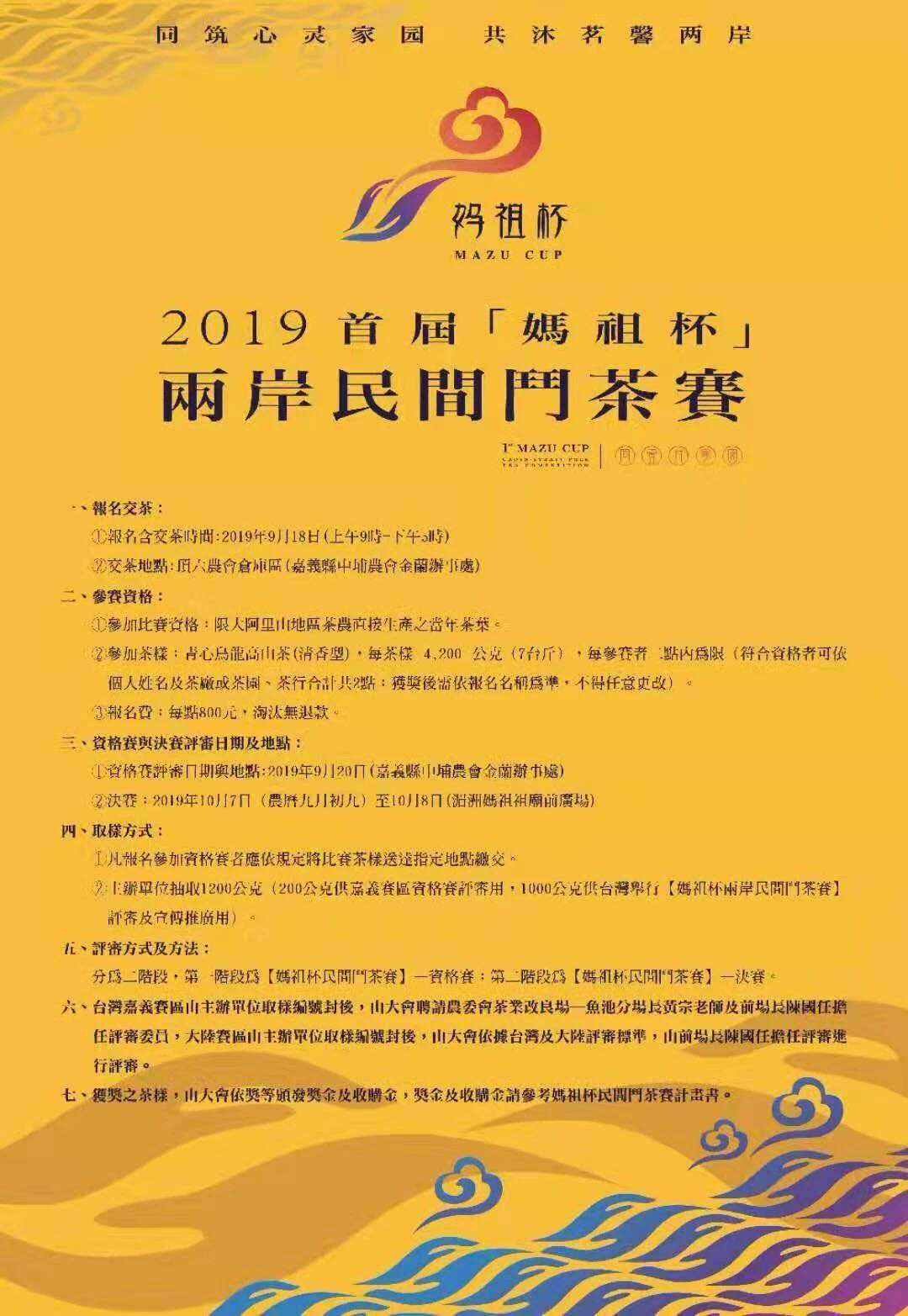 为了进一步弘扬茶文化,促进两岸茶业交流,为茶企业、茶商、茶叶爱好者、八方游客构建一个良好的茶叶互动交流平台,经民革莆田市委决定,将于2019年9月18日开展“首届妈祖杯两岸民间斗茶赛”初赛,内设大众品茗区,诚邀各界茶文化爱好者前来品茗观战,见证两岸茶文化交流的一大盛事!