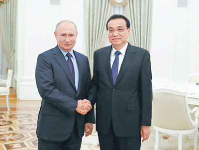 李克强首先转达习近平主席对普京总统的诚挚问候。李克强表示,中俄互为最大近邻,今年适逢两国建交70周年。前不久,两国元首一致同意将中俄关系提升为新时代全面战略协作伙伴关系。我此访同梅德韦杰夫举行中俄总理第二十四次定期会晤,全面规划两国各领域交往与合作,取得诸多新成果。中俄关系保持健康稳定发展,不仅有利于双方,有利于地区,也有利于世界。中方愿同俄方持续巩固友谊,深化合作,加强交往,维护以联合国为核心的国际体系和以世界贸易组织规则为基础的多边贸易体制,这对促进世界发展繁荣与和平稳定具有重要意义。