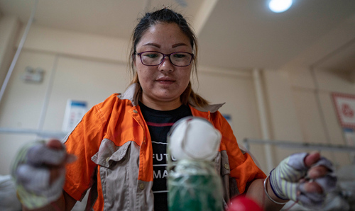 云南省怒江傈僳族自治州福贡县匹河乡托坪易地扶贫搬迁安置点居民在扶贫车间内制作棒球(9月17日摄)。