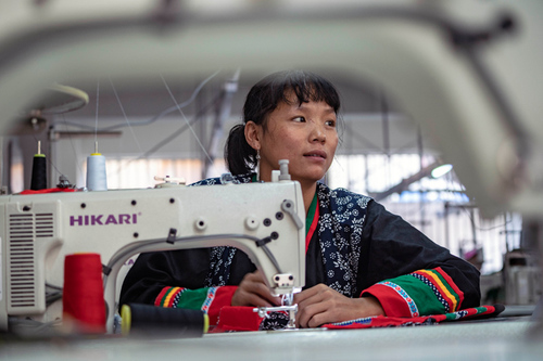 云南省怒江傈僳族自治州泸水市巴尼小镇易地扶贫搬迁安置点居民在扶贫车间内制作民族服饰(9月16日摄)。