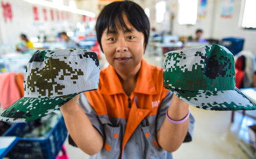 9月18日,在深州市高古庄镇凤凰池村“扶贫车间”,村民在展示军训帽。