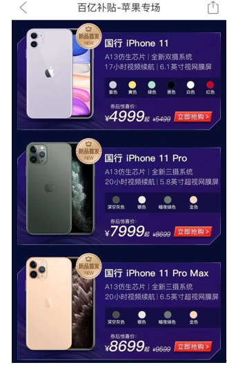 ▲拼多多上的iPhone 11、iPhone 11 Pro和iPhone 11 Pro Max券后起售价分别为4999元、7999元和8699元,均创下新款iPhone全网最低发售价。