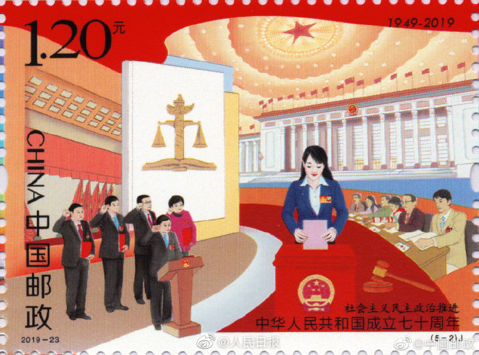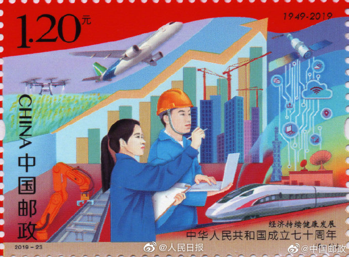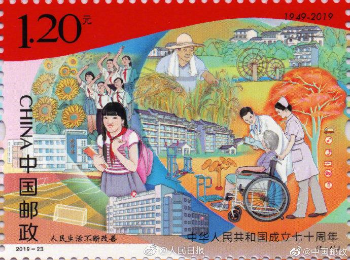 中国邮政定于2019年10月1日发行《中华人民共和国成立七十周年》纪念邮票1套5枚,小型张1枚。小型张图案名称为:祝福祖国。全套邮票面值12元。另与香港邮政、澳门邮电共同印制发行同题材小型张本票1本,内含中国邮政、香港邮政、澳门邮电小型张各1枚。