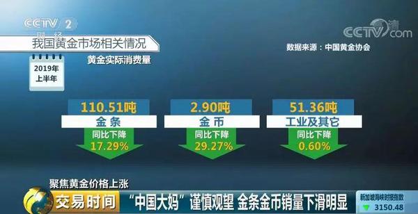 根据中国黄金协会数据显示:2019年上半年,全国黄金实际消费量中,金条110.51吨,同比下降17.29%;金币2.90吨,同比下降29.27%;工业及其他51.36吨,同比下降0.60%。金条、金币需求则明显下滑。