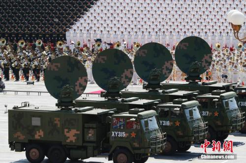 资料图:2015年9月3日,纪念中国人民抗日战争暨世界反法西斯战争胜利70周年大会在北京隆重举行,图为指挥信息系统装备方队接受检阅。