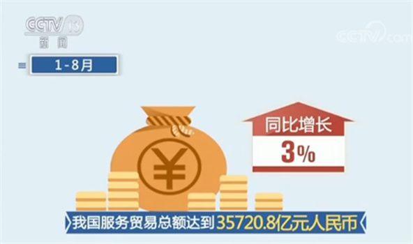 数据显示,1-8月,我国服务贸易总额达到35720.8亿元人民币,同比增长3%。其中,出口12645.6亿元,增长9.7%;进口23075.2亿元,下降0.3%。