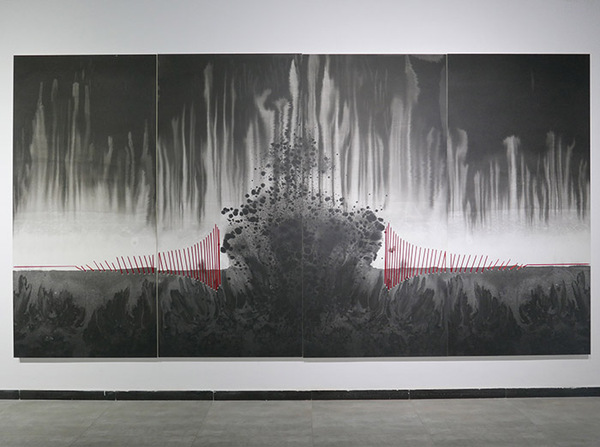 天地之间 117cm×243cm×4 宣纸水墨 丝线 金属 2019年