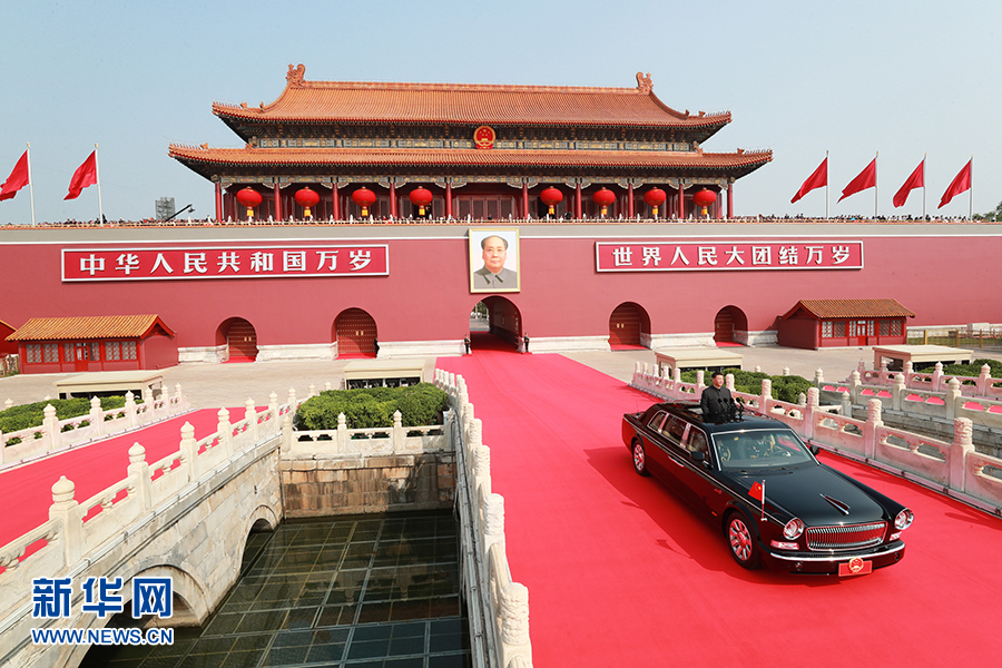 10月1日,庆祝中华人民共和国成立70周年大会在北京天安门广场隆重举行。中共中央总书记、国家主席、中央军委主席习近平发表重要讲话并检阅受阅部队。这是习近平乘坐检阅车,经过金水桥,驶上长安街。 新华社记者 燕雁 摄
