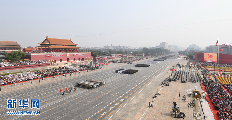 雄壮的军乐声中,习近平乘车沿着宽阔的长安街,依次检阅15个徒步方队、32个装备方队。近15000名受阅官兵整齐列阵、英姿勃发,580台受阅装备在阳光下熠熠生辉。这是中国特色社会主义进入新时代的首次国庆阅兵,也是共和国武装力量改革重塑后的首次整体亮相。