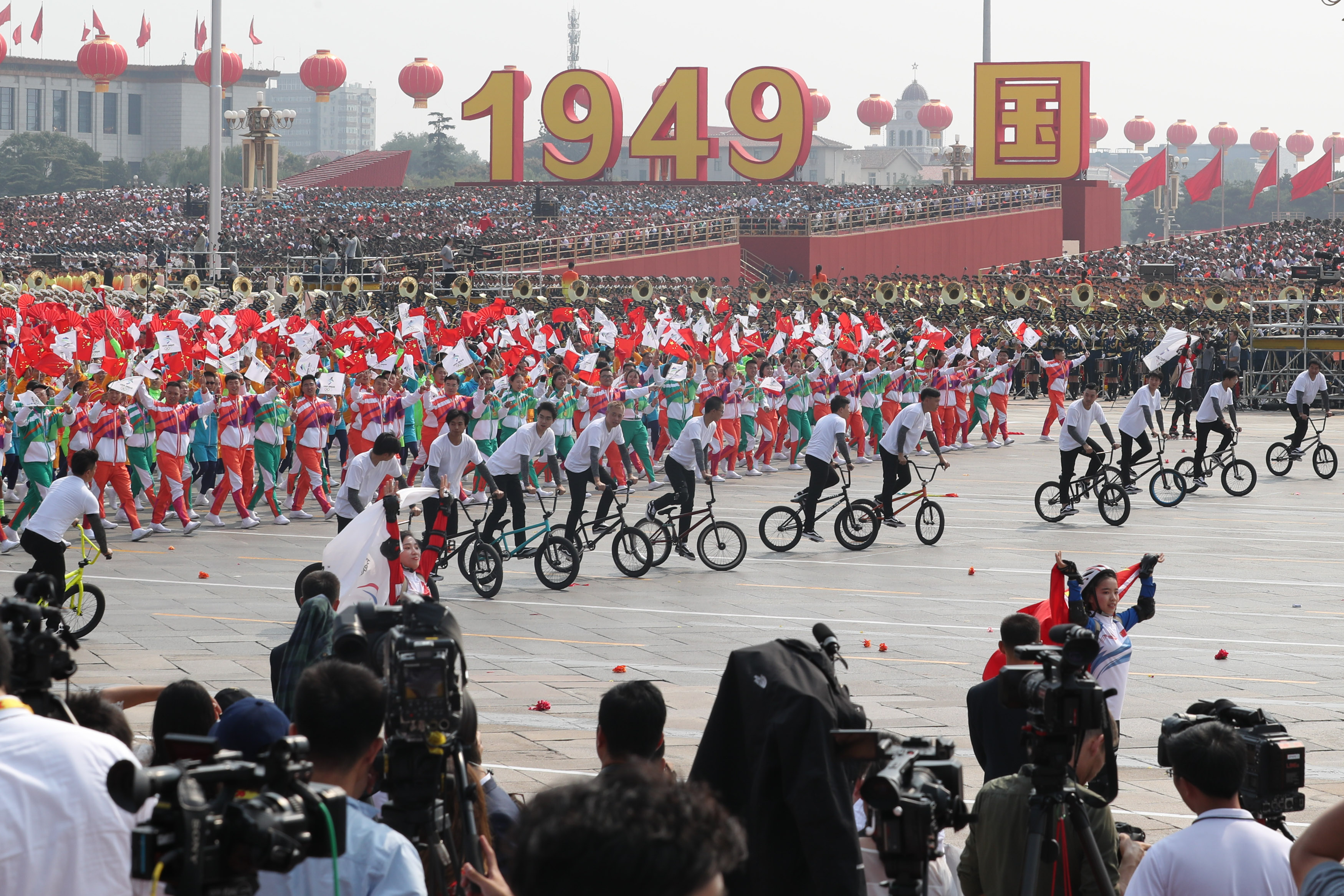 我所在的“体育强国”方队的元素最多,听指挥说,除我们跑团外,还有轮滑、小轮车、街舞、广场舞大妈、运动员等等元素。我们这200多人来自“京范儿”跑团,是一群喜爱用腿丈量世界的人,我们代表着全国成上千万名马拉松爱好者。马拉松在我国普及时间并不长,这次新中国成立70周年庆祝大会,我作为跑者能参加这次活动,感觉特别幸运。