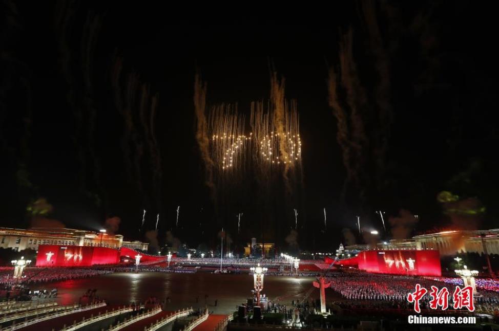 国庆70周年联欢活动于10月1日晚8时在天安门广场举行,整个联欢活动由主题表演、中心联欢表演、群众联欢、烟花表演四个功能表演区组成。图为璀璨的烟花在天安门广场上空绽放。中新社记者 盛佳鹏 摄