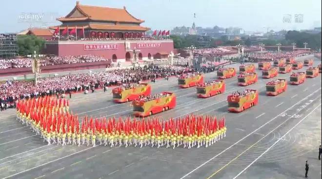10月1日,庆祝中华人民共和国成立70周年大会在北京天安门广场隆重举行。上午11时32分,伴随着广场电子屏幕上出现的“伟大的中国人民万岁”“伟大的中国共产党万岁”“伟大的中华人民共和国万岁”标语和万千群众唱响的《今天是你的生日,中国》歌曲,“同心共筑中国梦”主题群众游行开始了。