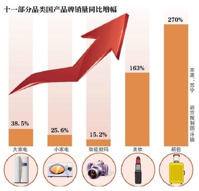 苏宁2019国庆大数据显示,10月1日至7日,国产品牌销量同比增长16.2%,是进口品牌销量增长的4倍。其中,大家电、小家电、智能数码、美妆和箱包的国产品牌销量分别同比增长38.5%、25.6%、15.2%、163%和270%。