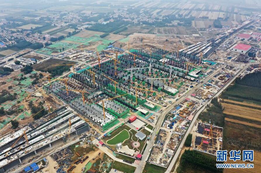 10月10日,建设中的雄安站。京雄城际铁路雄安站总建筑面积约47万平方米,地上3层,地下2层。目前,地下主体结构基本完工,地上主体结构施工已经开始。新华社记者 邢广利 摄