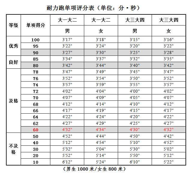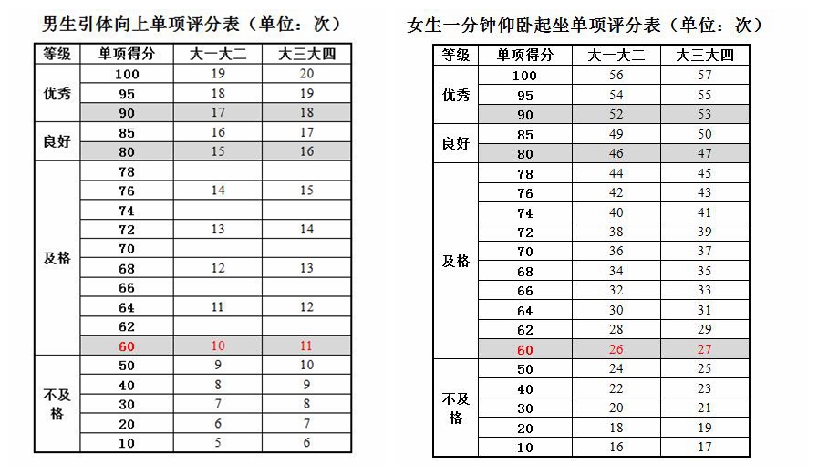 除了以上的标准分外,同学们还可以通过引体向上(男)、1分钟仰卧起坐(女)和耐力跑项目的突出表现获得加分,具体加分标准均为在学生成绩超过单项评分100分后,以超过的次数所对应的分数进行加分,具体加分情况如下: