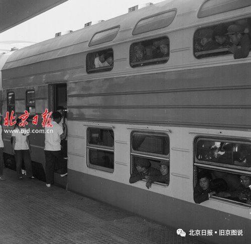 1960年,北京火车站,双层旅客列车停在北京车站。 李士民摄 图片来源:北京日报