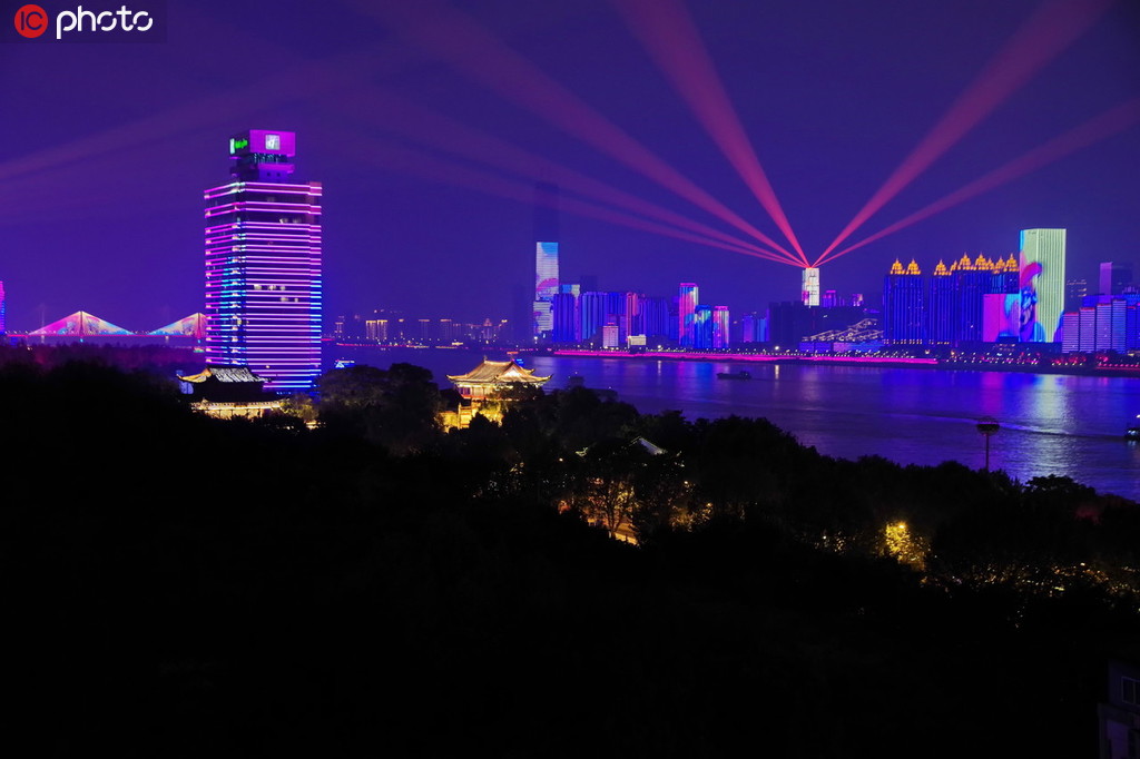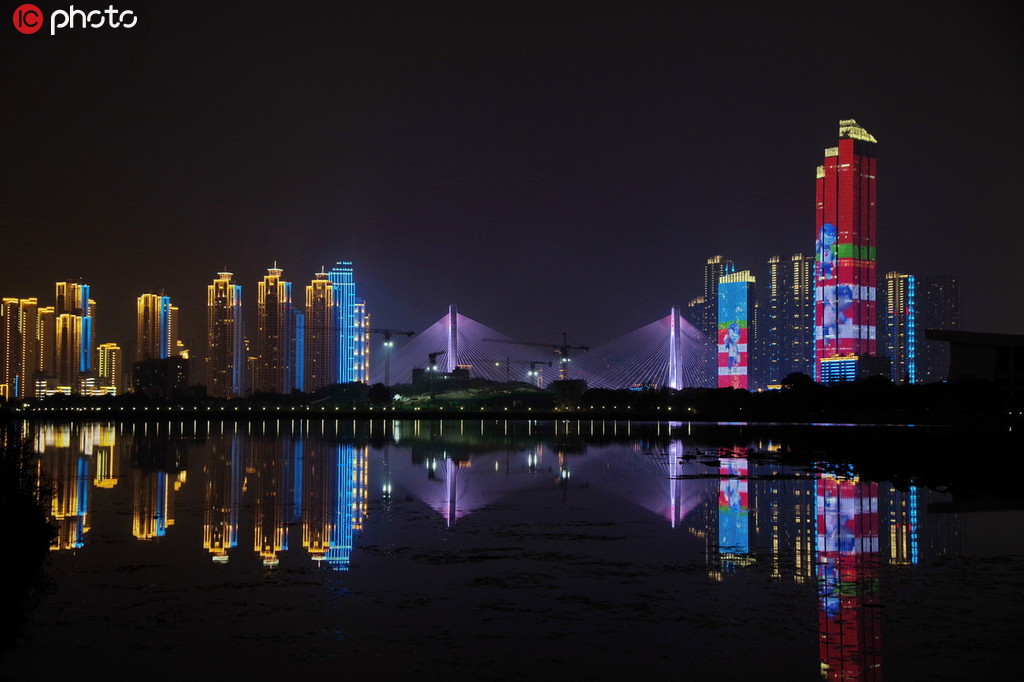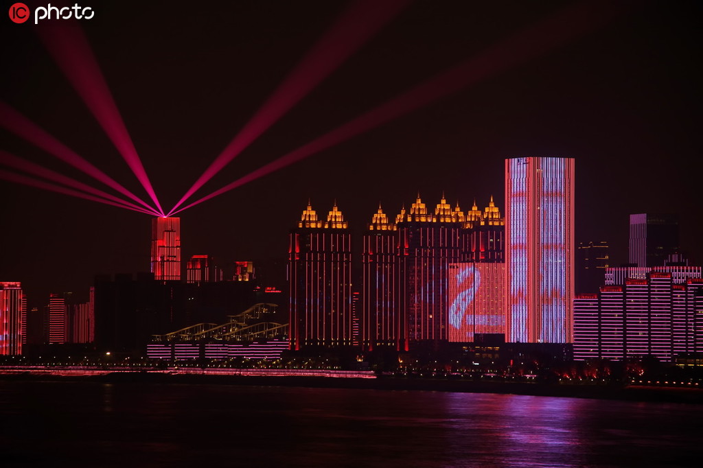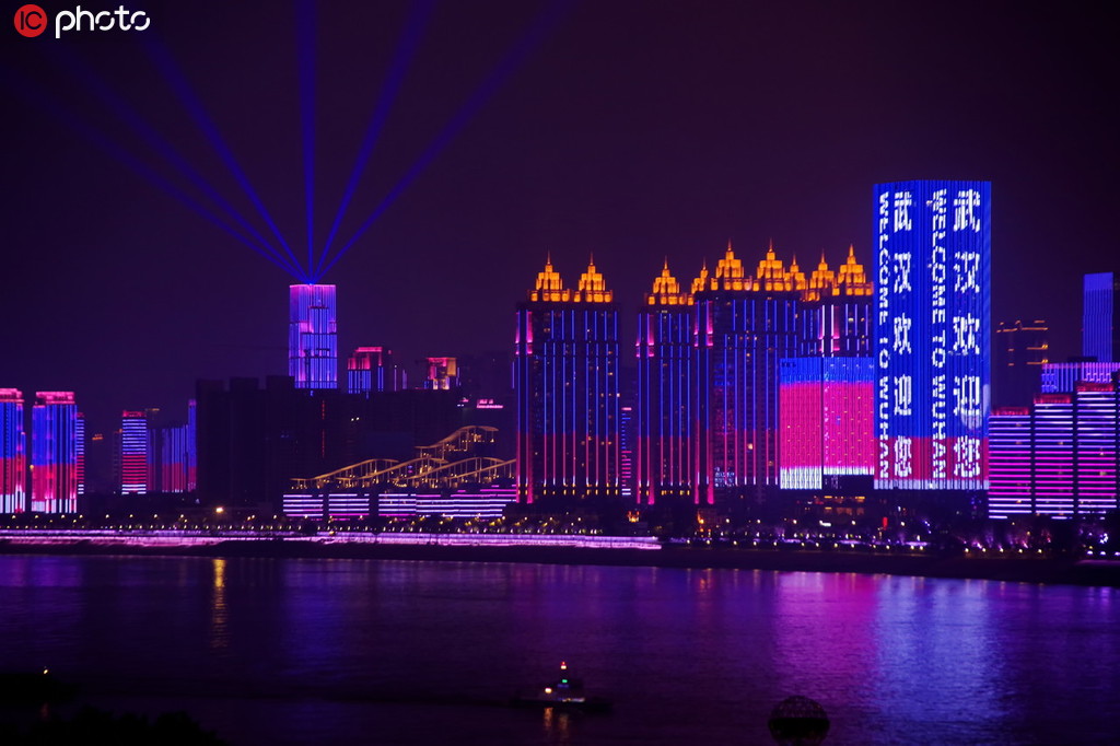 2019年10月17日,武汉,第七届世界军人运动会即将在武汉举行,以迎接军运会为主题的灯光秀在武汉精彩上演,两江四岸建筑物披上五彩霓裳,吉祥物“兵兵”的形象在楼宇间穿梭,“武汉欢迎您”5个大字占满整栋高楼,美丽江城,流光溢彩迎军运。(IC photo)