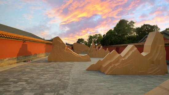 同时,假山将空间围格成宽窄不一的行进空间,形成展览空间中蜿蜒的“道路”,模拟出传统中式山水园林的氛围,与故宫的红墙黄瓦相映成辉,让参观者在“山间”折返前行、移步换景。观者一步一景折返前行的探索,如同真的在怪石嶙峋的群山之间散步,千姿百态的景色自然浮现眼前,可谓“人在画中游”。