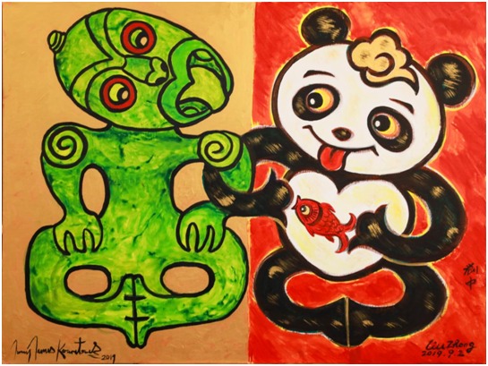 两位画家都擅长绘画动物,刘中用黑白红三色绘画了一只手捧金鱼的中国国宝熊猫。熊猫憨态可掬、栩栩如生。它手捧的红色金鱼在中国代表“年年有余”。对于起源于海洋的毛利族人来说,金鱼也是美好生活和风调雨顺的象征。詹姆斯主要用绿色绘制了毛利族的吉祥物TiKi。TiKi代表着传统的毛利族人形象,可以说是毛利族人的图腾。两位画家将熊猫和TiKi画成手挽手、肩并肩的姿态,并且整体来看两个吉祥物刚好形成了两个8的形状。8在中国代表“发”。作品寓意中国和新西兰两个国家在“一带一路”上携手并进、共同发展、共同繁荣。邮票附图分别是刘中的《熊猫》和詹姆斯的《来自西方的信息》。
