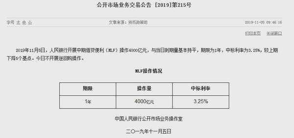 中新经纬客户端11月5日电 据央行网站消息,5日,央行开展中期借贷便利(MLF)操作4000亿元,与当日到期量基本持平,期限为1年,中标利率为3.25%,较上期下降5个基点。今日不开展逆回购操作。