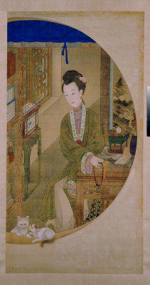 这样的习惯一直延续至清朝。在清初宫廷画家所作的《十二美人图》中,就有一幅《捻珠观猫图》。图中美人于圆窗前端坐,轻倚桌案,一手娴雅地捻着念珠,观赏两只游玩淘气的猫咪。