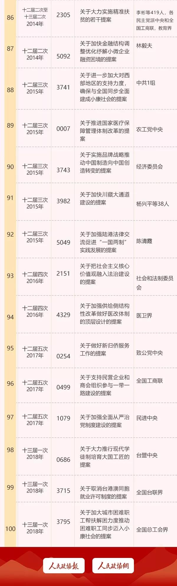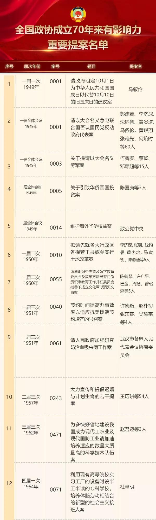 为充分展示人民政协成立70年来提案发挥的独特作用和产生的重要影响,在各民主党派中央和全国工商联、有关人民团体、全国政协各专门委员会以及各省(自治区、直辖市)政协和副省级市政协广泛推荐的基础上,政协第十三届全国委员会开展了评选工作。经全国政协主席会议审议,决定对《请政府明定10月1日为中华人民共和国国庆日以代替10月10日的旧国庆日的建议案》等100件全国政协成立以来有影响力重要提案予以表彰。