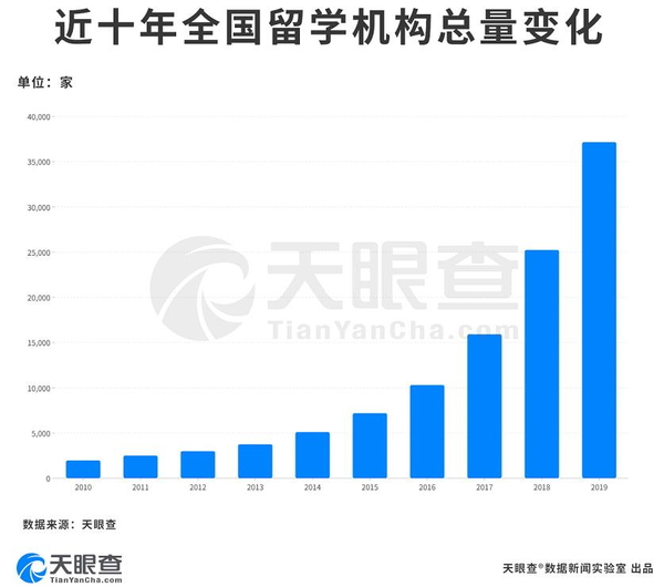 2017年以来,留学中介企业数量增长迅猛。天眼查根据经营范围中含“出国留学中介服务”的企业信息统计显示,2016-2018年留学机构总量分别为10306家、15914家及25238家,而截至11月6日总量升至37172家。