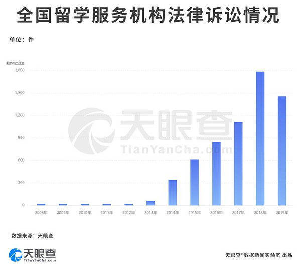 此外,留学服务机构的法律诉讼信息数量逐年上升,2018年相关企业法律诉讼量超过1700件;截至10月31日,2019年留学机构法律诉讼量已超过1600件;诉讼总量累计超过12800件。