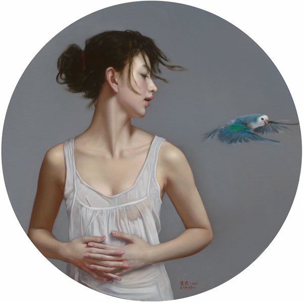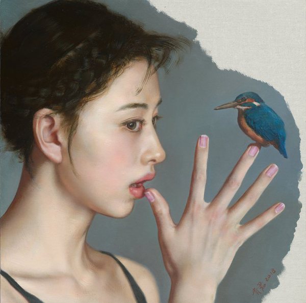 本次展览的主题“此时此刻”,是对艺术家绘画风格和创作思想的集中展示,同时也是李贵君对“此在之生命”的哲学追问。经历漫长的艺术探索,他从现代的立场出发,对西方古典文化和中国传统意趣进行重构与融合,以高超的写实语言追求对生命本身“美”的表达,借助女性生命展露出属于这个时代深处的目光、姿势和情态;同时将中国传统绘画中反复描绘的鸟、鱼、花等意象引入画面,带领画中的人物抽离原有的空间,打破宁静而富有秩序的古典情境。他用画笔将西方古典、东方传统与当代精神织构到同一幅画面上,为写实绘画打开了一条新的缝隙。