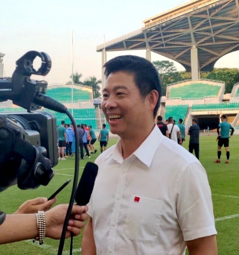 中国橄榄球队主教练肖恩(右)中国橄榄球队体能专家阿尔伯特(左)接受记者采访