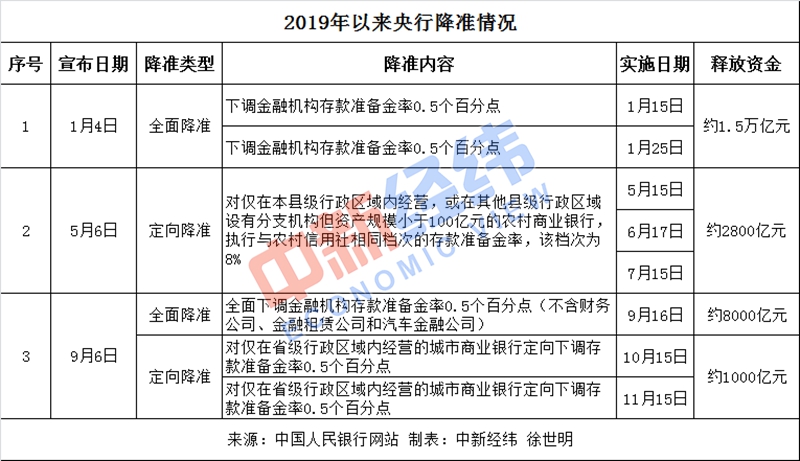 2019年以来,央行先后降准三次。包括1月份分两次实施的全面降准,5月份开始分三次实施的定向降准,9月份开始的全面降准与分两次实施的定向降准。