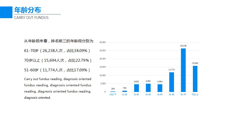 《爱尔眼科中国国人眼底病变状况大数据报告》依托爱尔眼科自主开发的目邻远程智能阅片系统,历时1年通过人工智能+远程阅片,共为68878人次进行了眼底阅片,其中眼底阅片异常数为12620,异常率为18.32%。而在61-70岁人群中,异常率增至21.39%,在70岁以上人群中,异常率更是高达25.61%。即每五位61-70岁的人群中,就有超过一位的眼底病变患者。